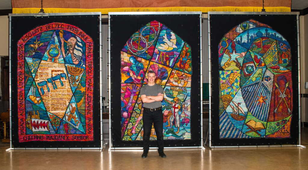 Kirk and seasoned writer Claire Ross Dunn co-wrote The Knitting Pilgrim, which uses the Stitched Glass panels – collectively over 90 pounds of knitting – as its set. The play recounts Kirk’s artistic and spiritual journey of hand-knitting the project, and his hope to contribute to the vital conversation about xenophobia, Antisemitism and Islamophobia, dealing with internal/external strife, and fear of the other.